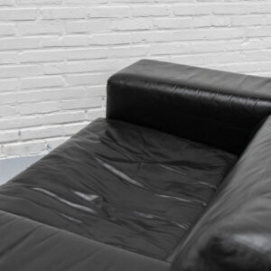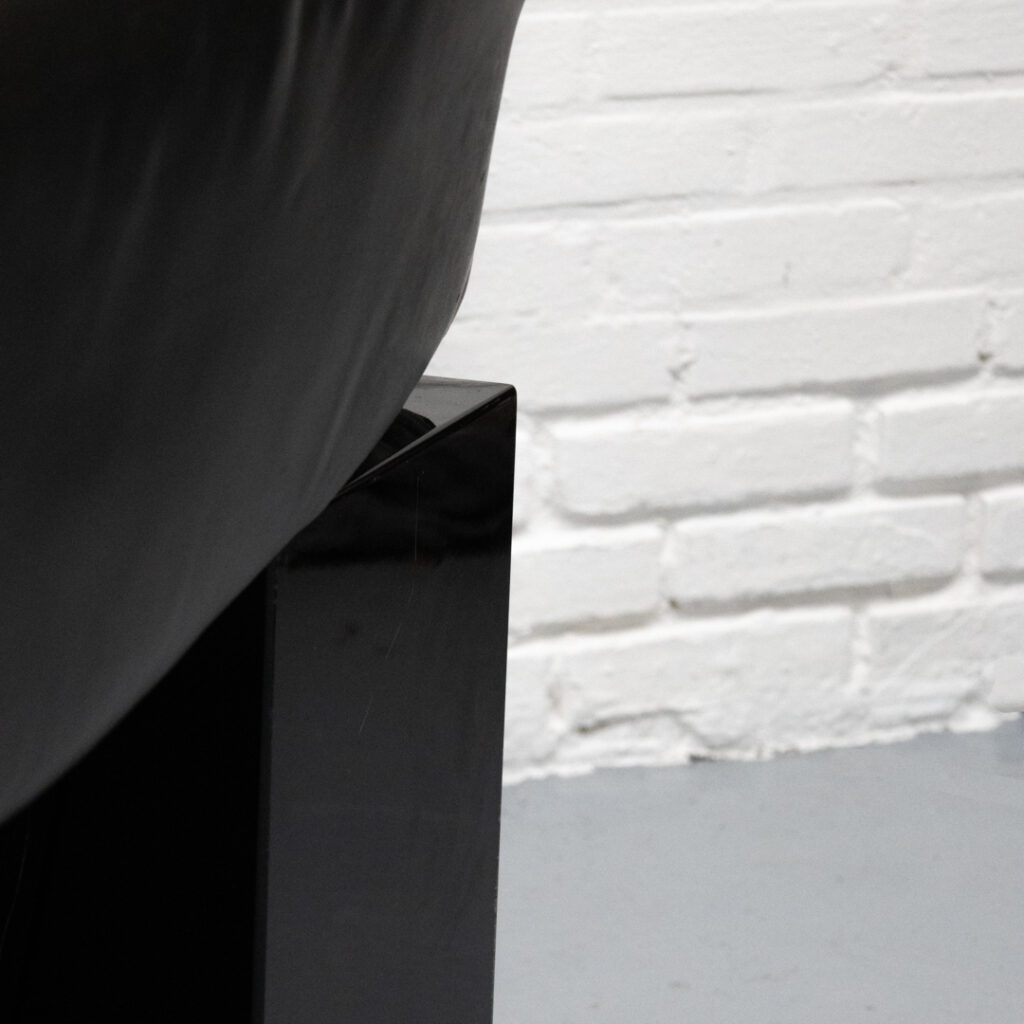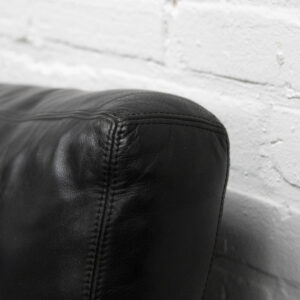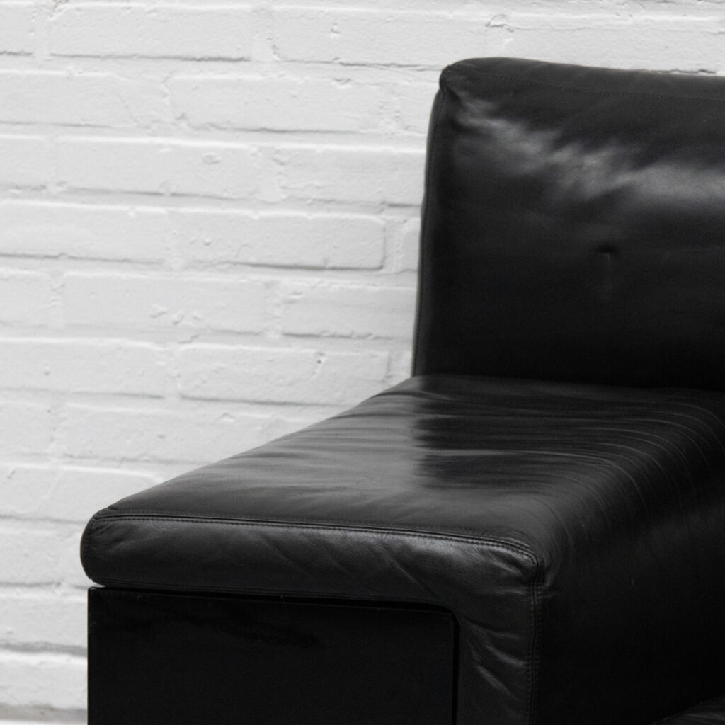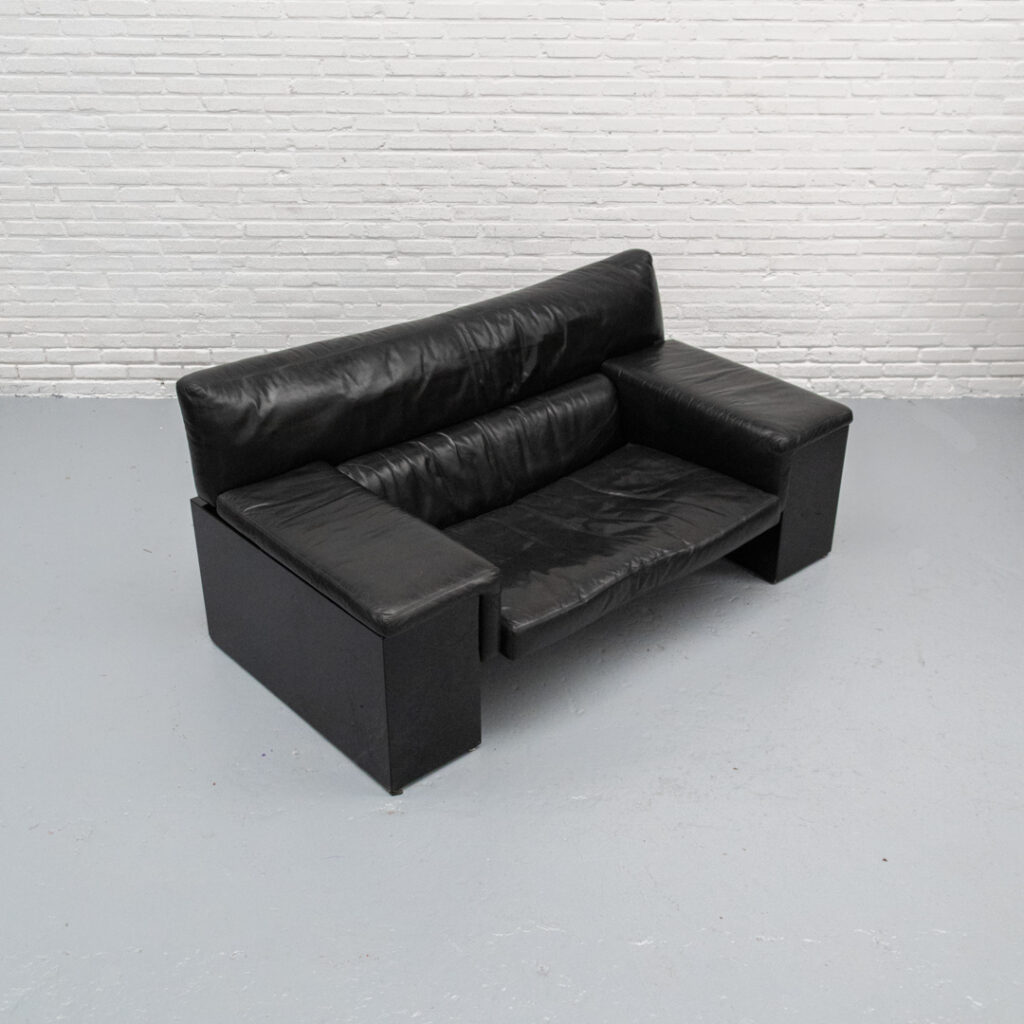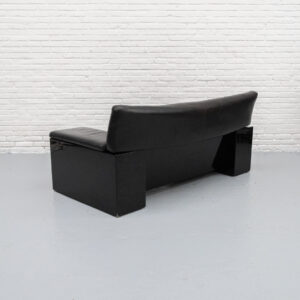 ‘Brigadier’ two-seater sofa designed by Cini Boeri for Knoll International in 1978. A striking example of late 1970s Italian design, defined by its minimalist architectural form and integrated leather cushions. The sofa features a black high-gloss lacquered wooden frame and original black leather upholstery with a beautiful patina. An award-winning piece that combines elegance and structural strength. In original condition with minor wear consistent with age.