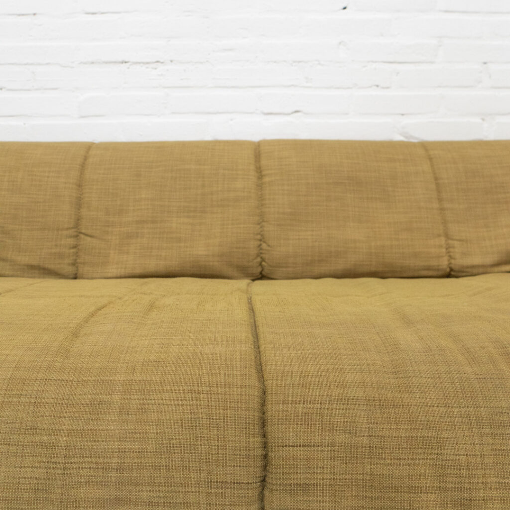 The sofa is upholstered in a sand–sage green fabric with a natural, matte appearance. The surface is defined by the characteristic modular quilted structure, with regular stitching that emphasizes the geometric construction of the design. The volume follows Boeri’s distinctive monovolume concept, featuring integrated armrests and a deep, carefully balanced seat. The proportions correspond precisely to the original design, and the padding has retained its shape and stability, indicating careful use and still providing a highly comfortable seating experience.