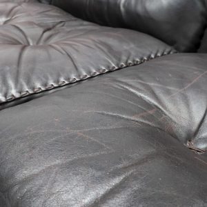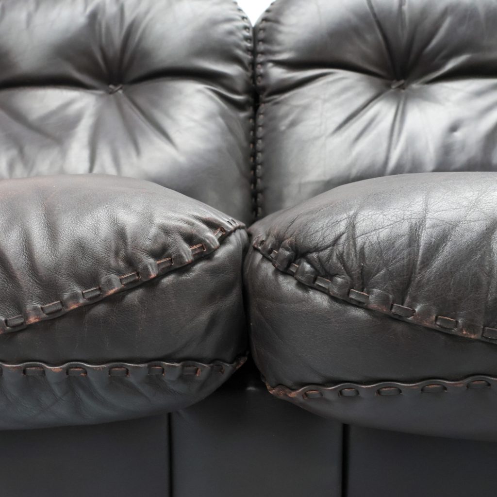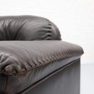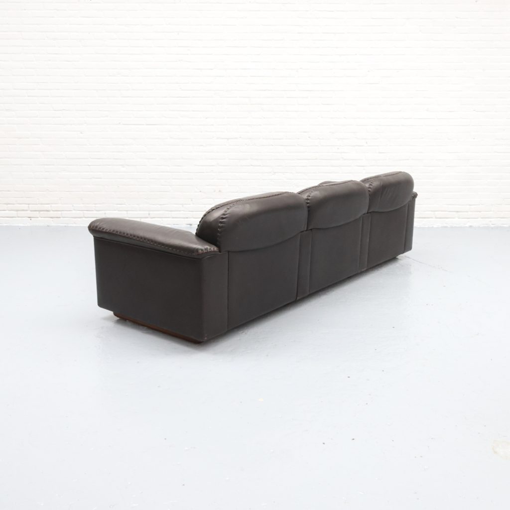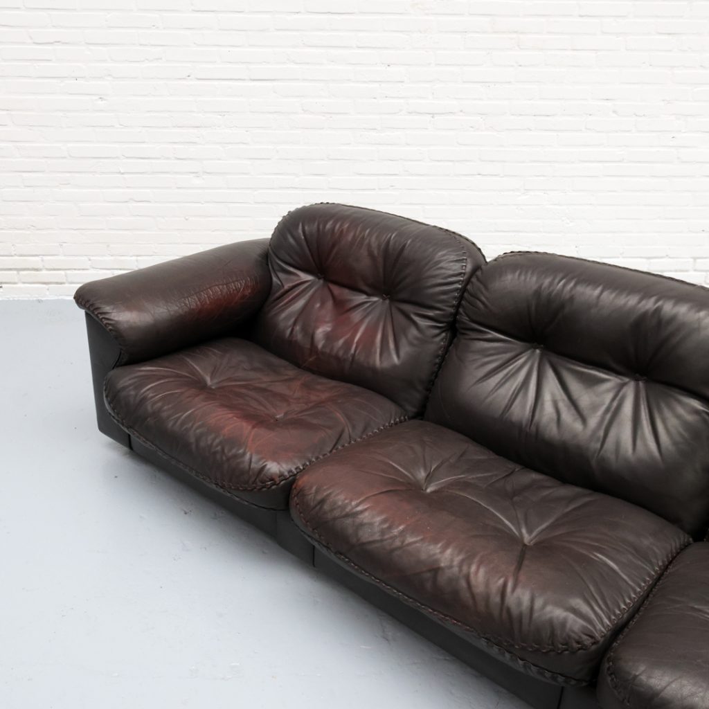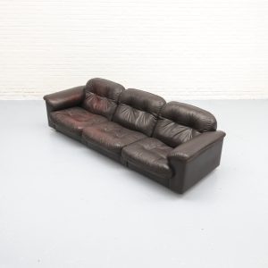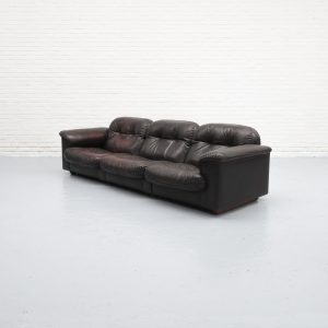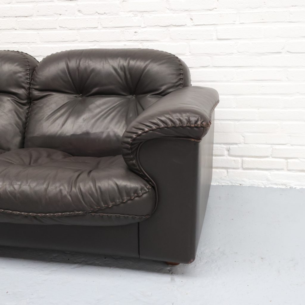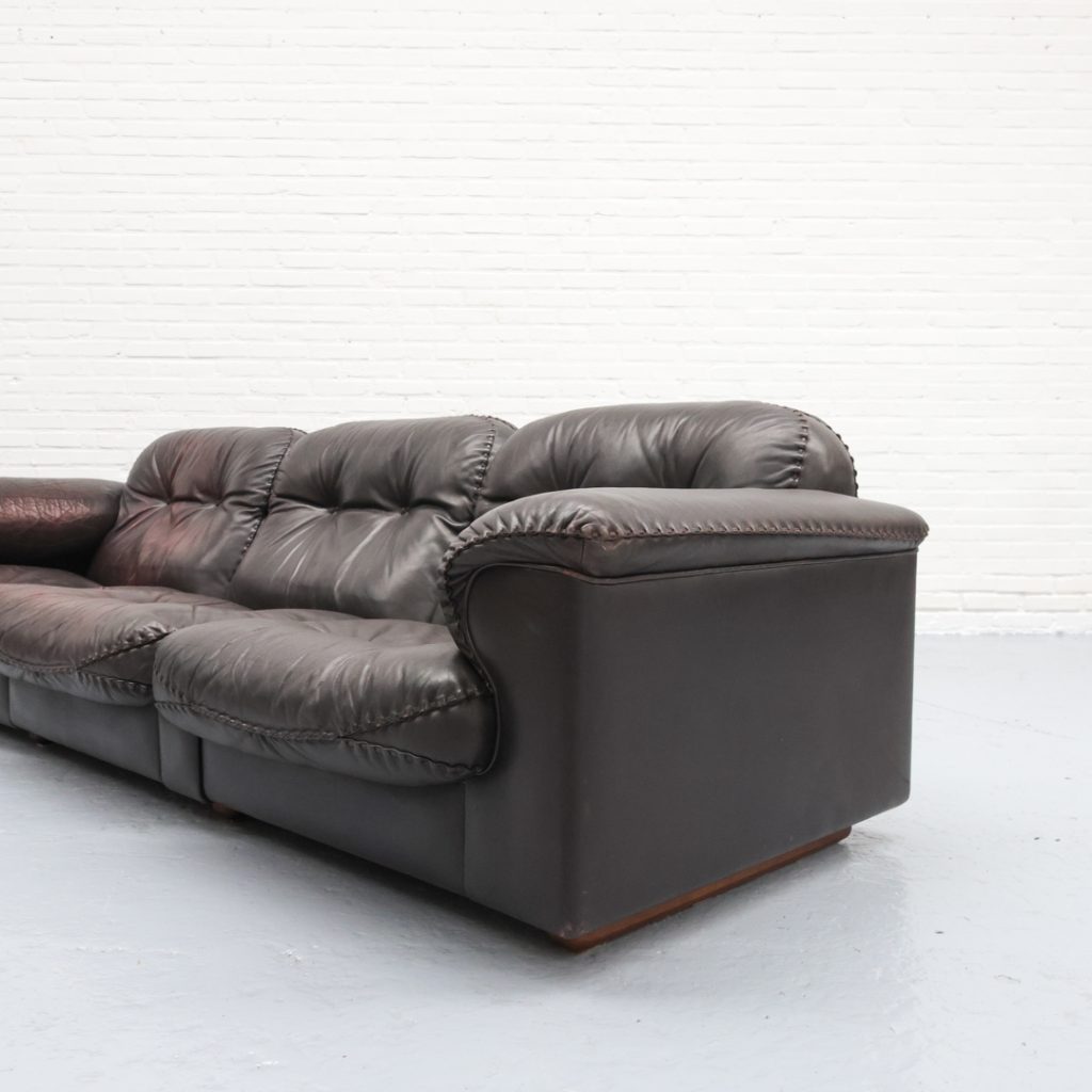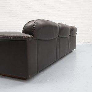 This high-quality and comfortable three-seater sofa, designed for De Sede in the 1970s, features individually extendable seats for the ultimate lounging experience. The DS101 model is renowned for its exceptional design and craftsmanship, combining hand-stitched seams and premium materials in a timeless and functional creation. The sofa is upholstered in dark brown leather, which has developed a beautiful patina that enhances its character and authenticity. Despite this natural aging, the sofa remains in good condition, with some signs of use consistent with its age, including subtle craquelé on one armrest.