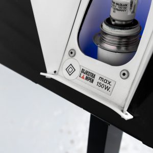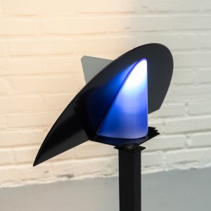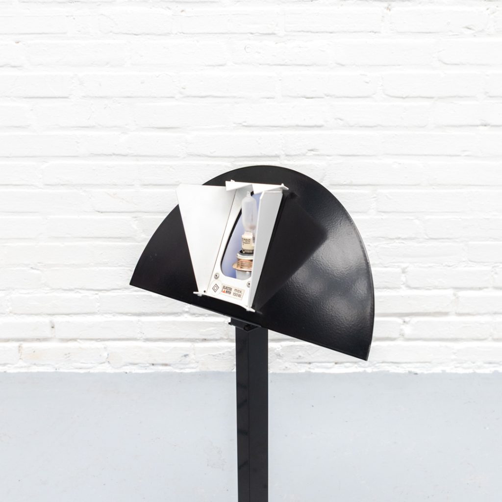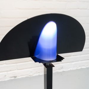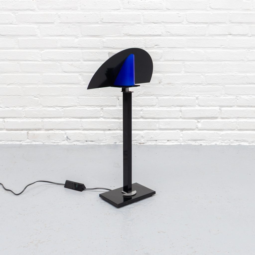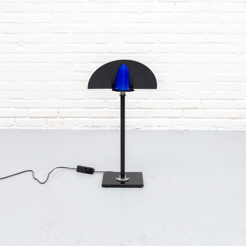 Rare postmodern table lamp from the 1980s, designed and produced by Dijkstra, the Netherlands. Made of black lacquered metal with a striking blue glass shade. The semi-circular metal screen and vertical base give the lamp a strong Memphis-inspired aesthetic. Equipped with an inline dimmer. The lamp is in very good vintage condition, with only minimal signs of use consistent with its age.