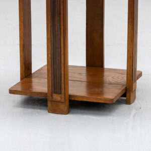 Dutch sidetable from the 1920s/30s, crafted from solid oak. The design features a clear, architectural construction with a round top and a lower secondary tier. The vertical supports are detailed with dark coromandel wood accents, providing a refined contrast to the warm oak. Restrained and structural in character, the table relates closely to the Hague School. In good vintage condition, with light signs of age-appropriate wear.