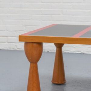 Rare coffee table from the Filicudi series, designed by Ettore Sottsass and Marco Zanini for Zanotta in 1993. A distinctive, sculptural design resting on four diabolo-shaped beechwood legs, giving the piece a playful yet well-balanced presence.