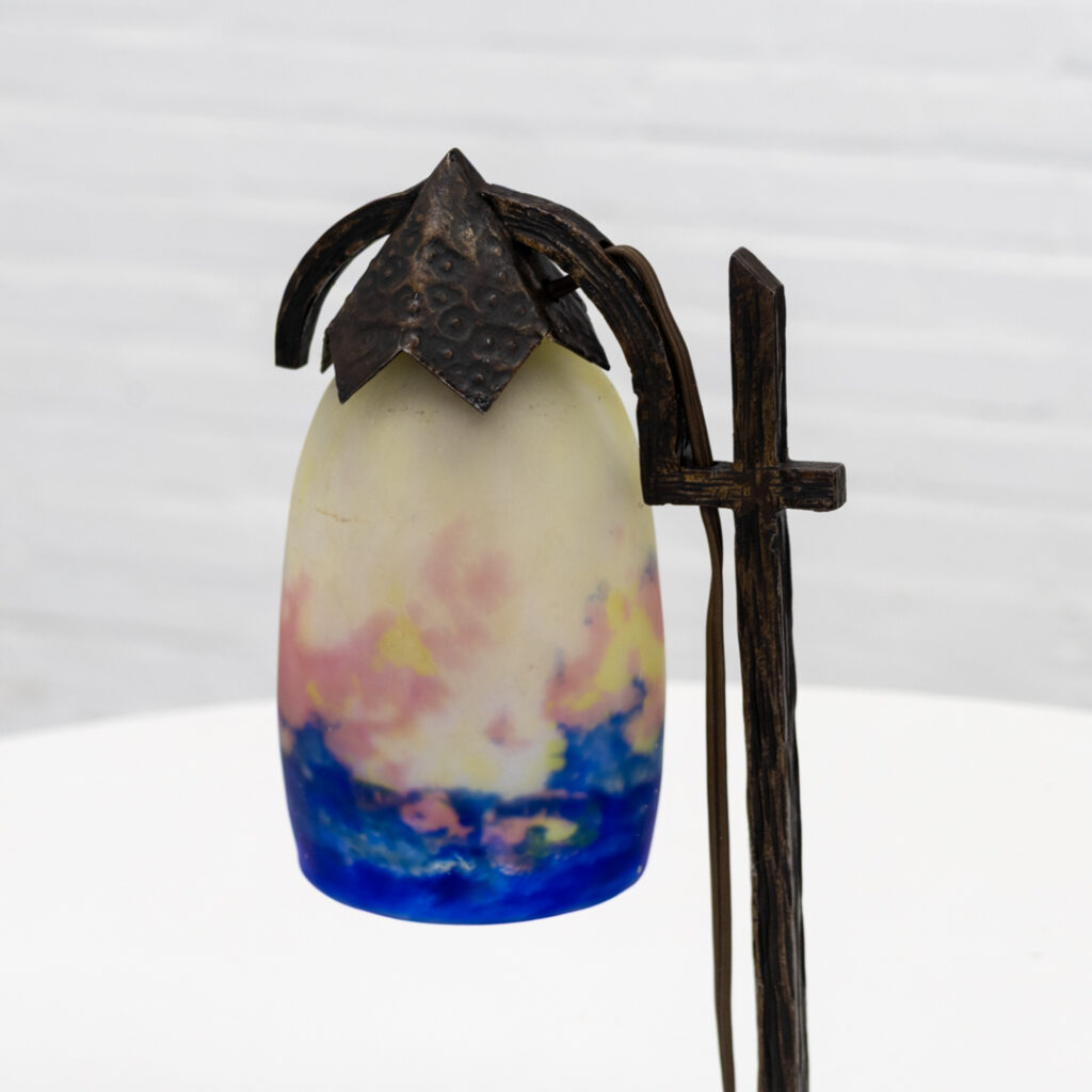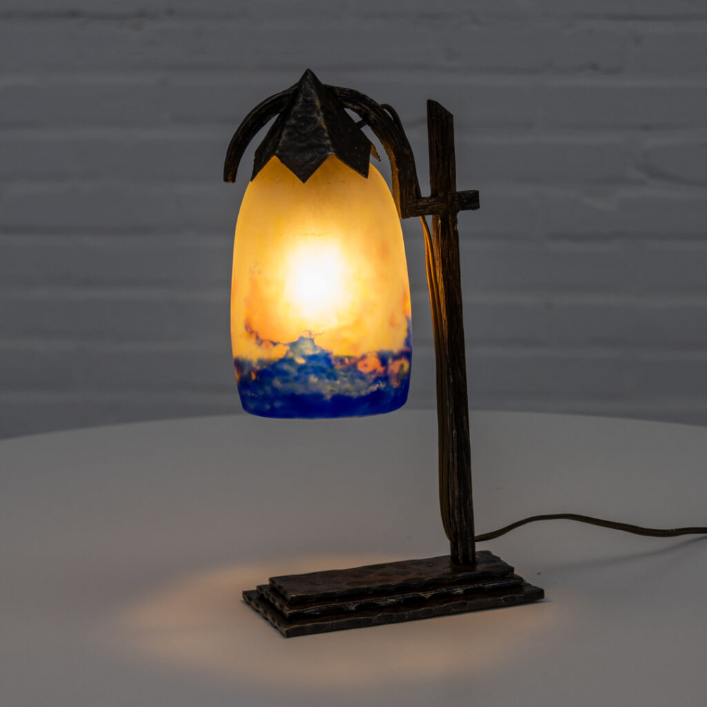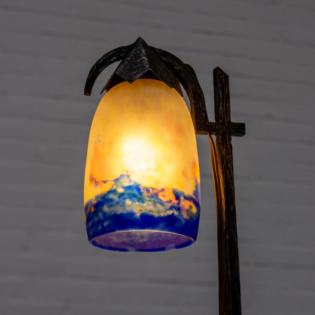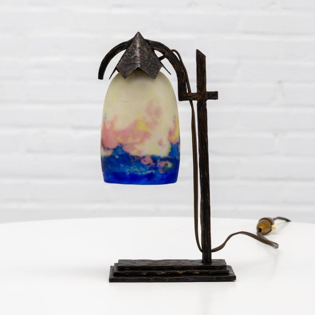 The lamp stands on a characterful wrought iron base with a clear, almost architectural structure. The marbled glass shade shows soft transitions from deep blue to warm amber and rose tones, which come to life beautifully when lit.