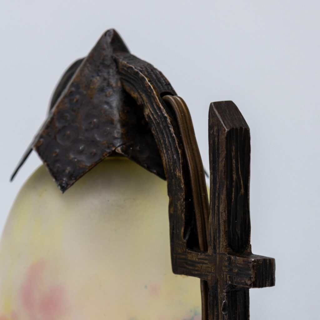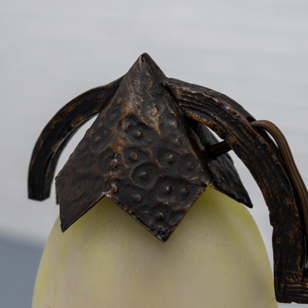 In good original condition, with light signs of use consistent with age. The glass is intact with no cracks or chips, and the wrought iron frame is stable with a nicely aged patina. Fitted with working wiring.