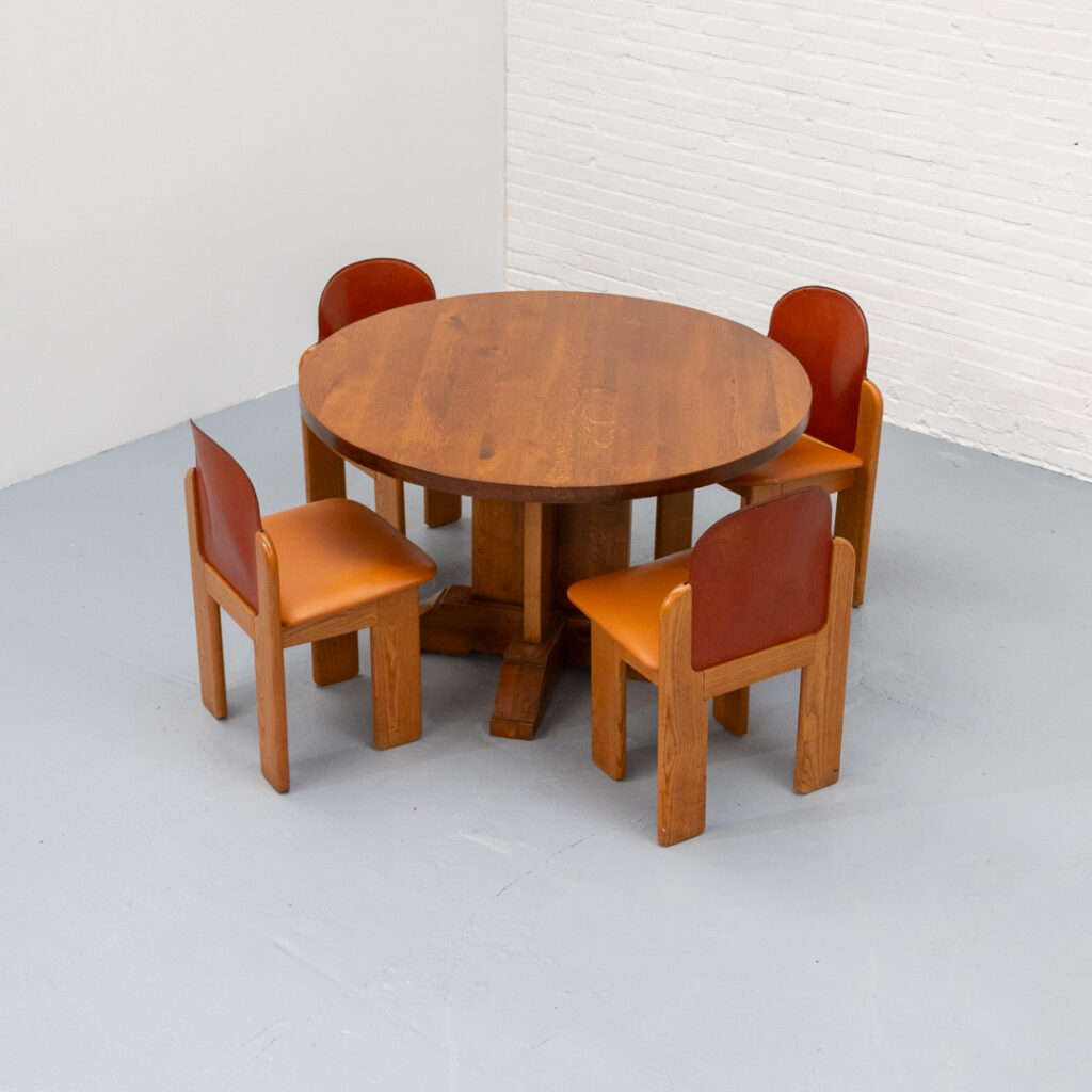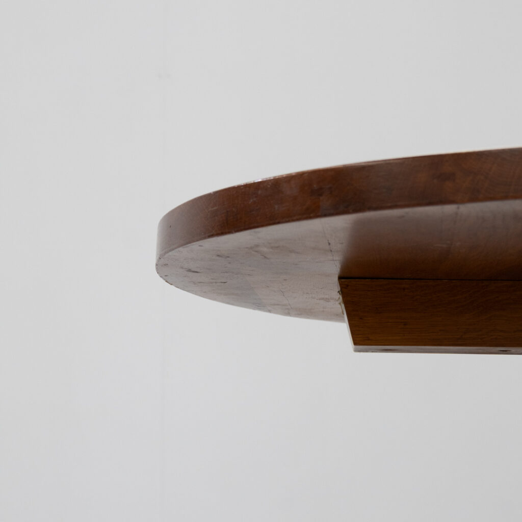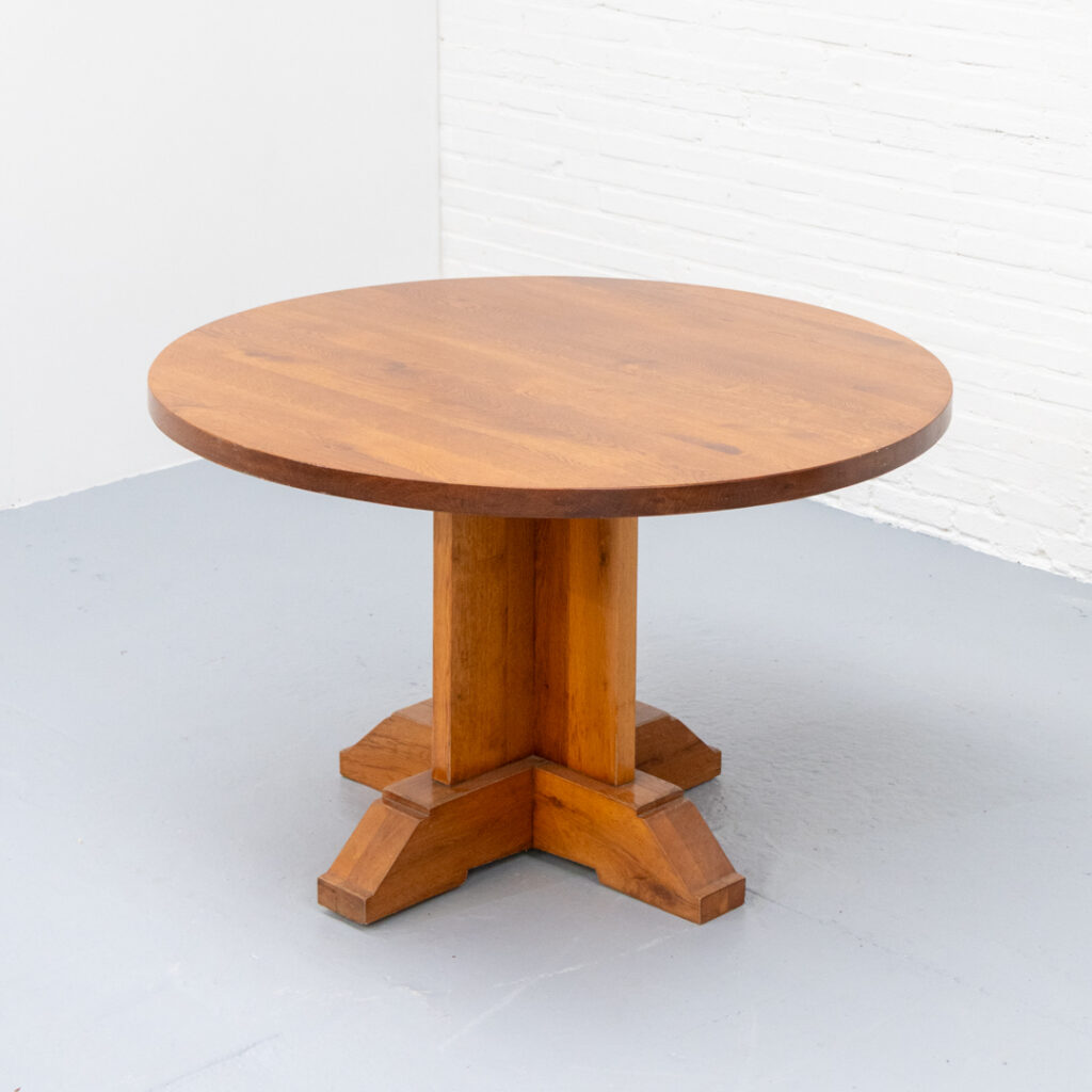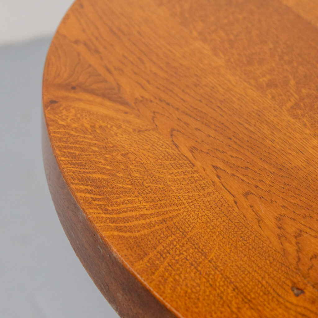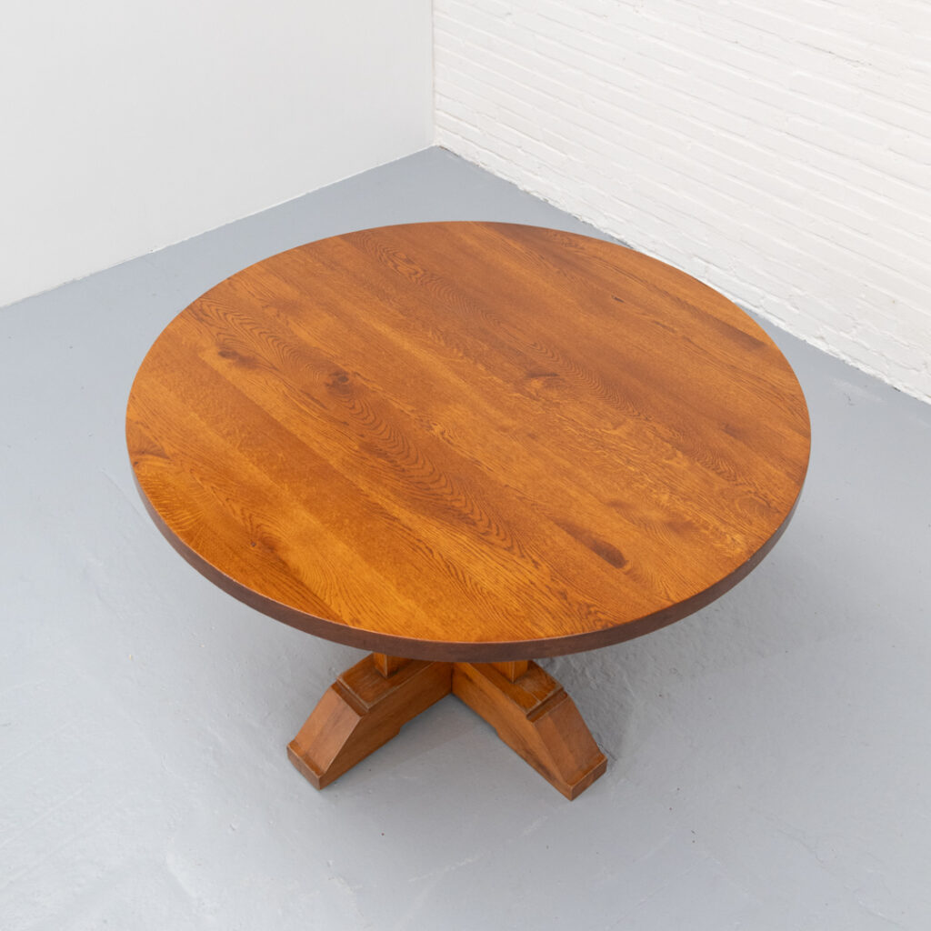 Round oak table, Italy, circa 1960. Made from solid oak and supported by a distinctive central cross base. The warm tone of the wood and the craftsmanship reflect the quality of Italian furniture design from that era. In very good vintage condition with light signs of use and a beautiful natural patina.