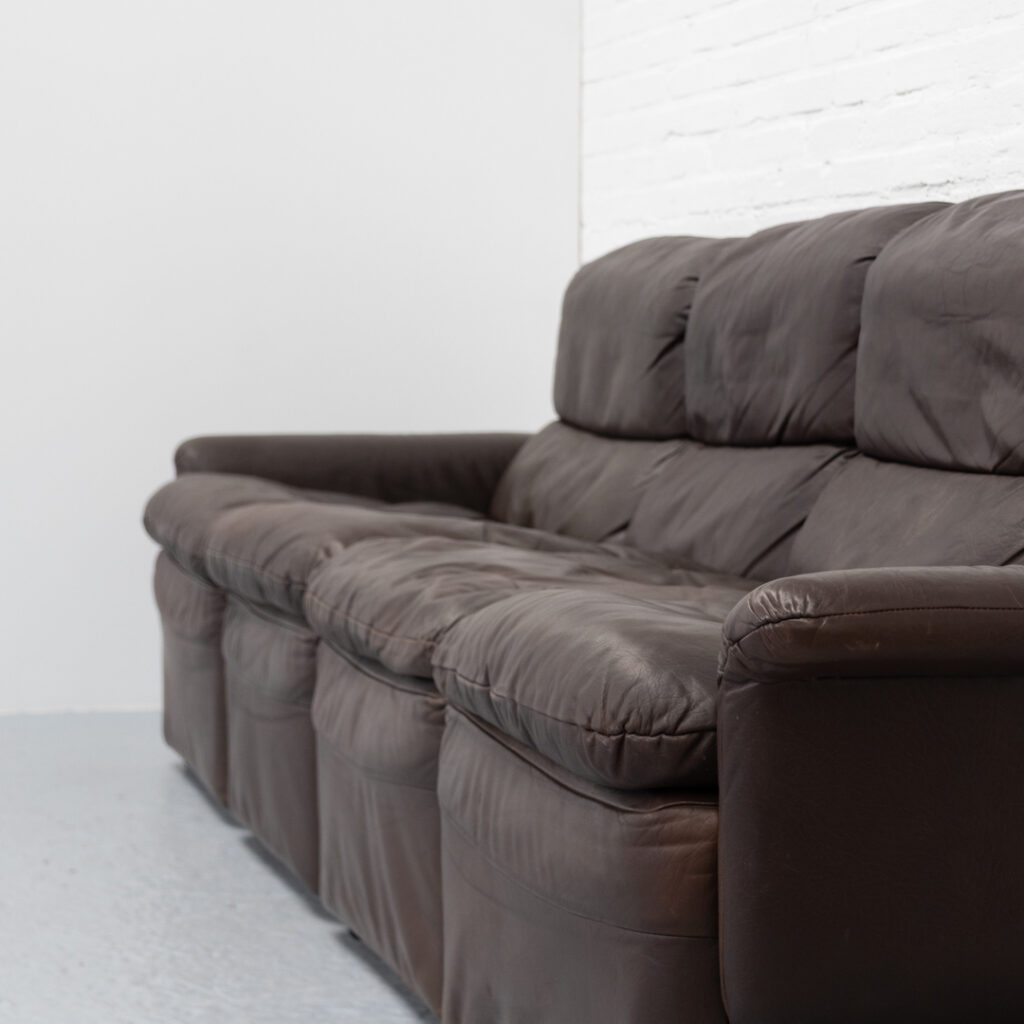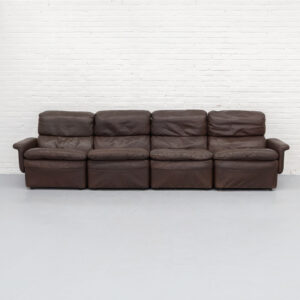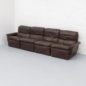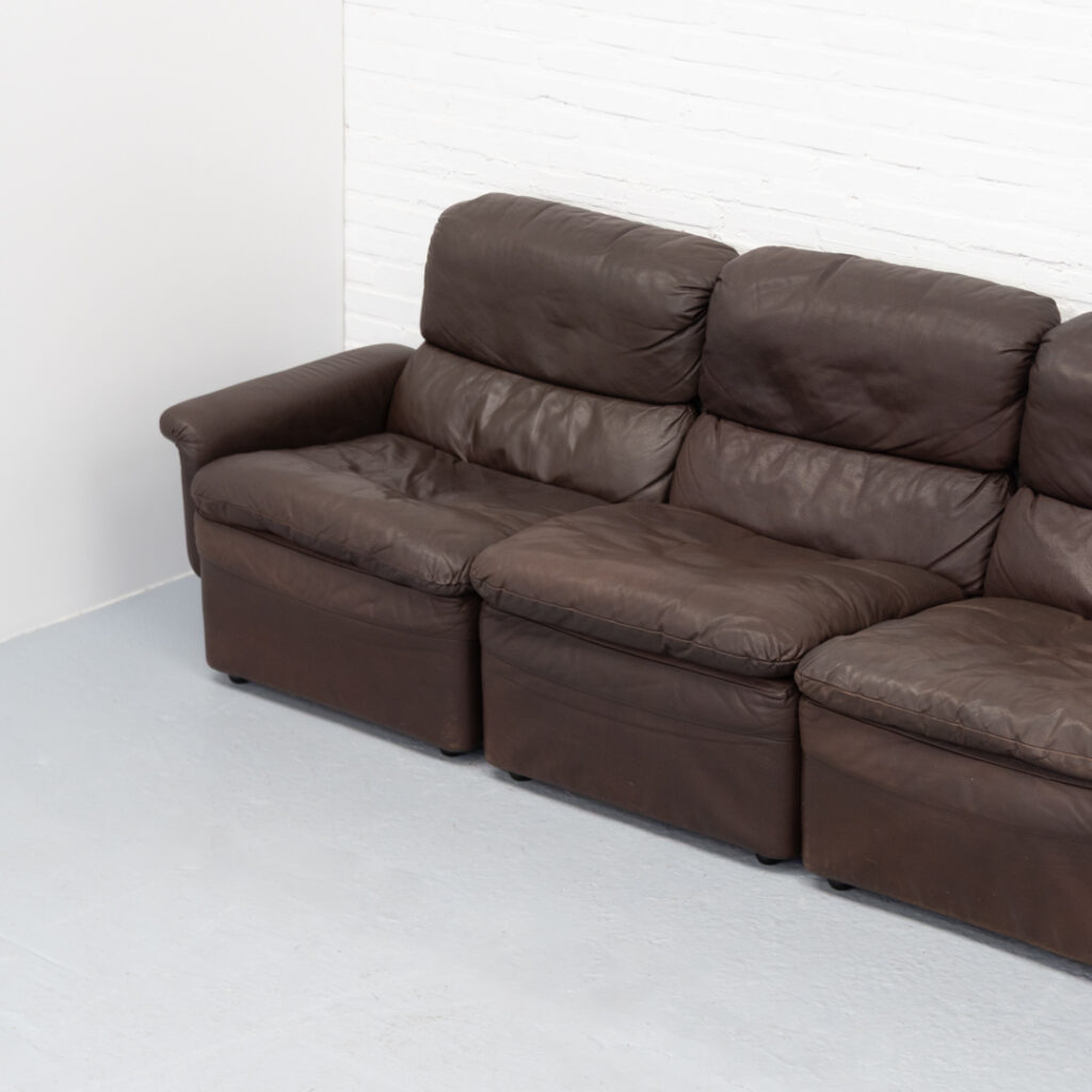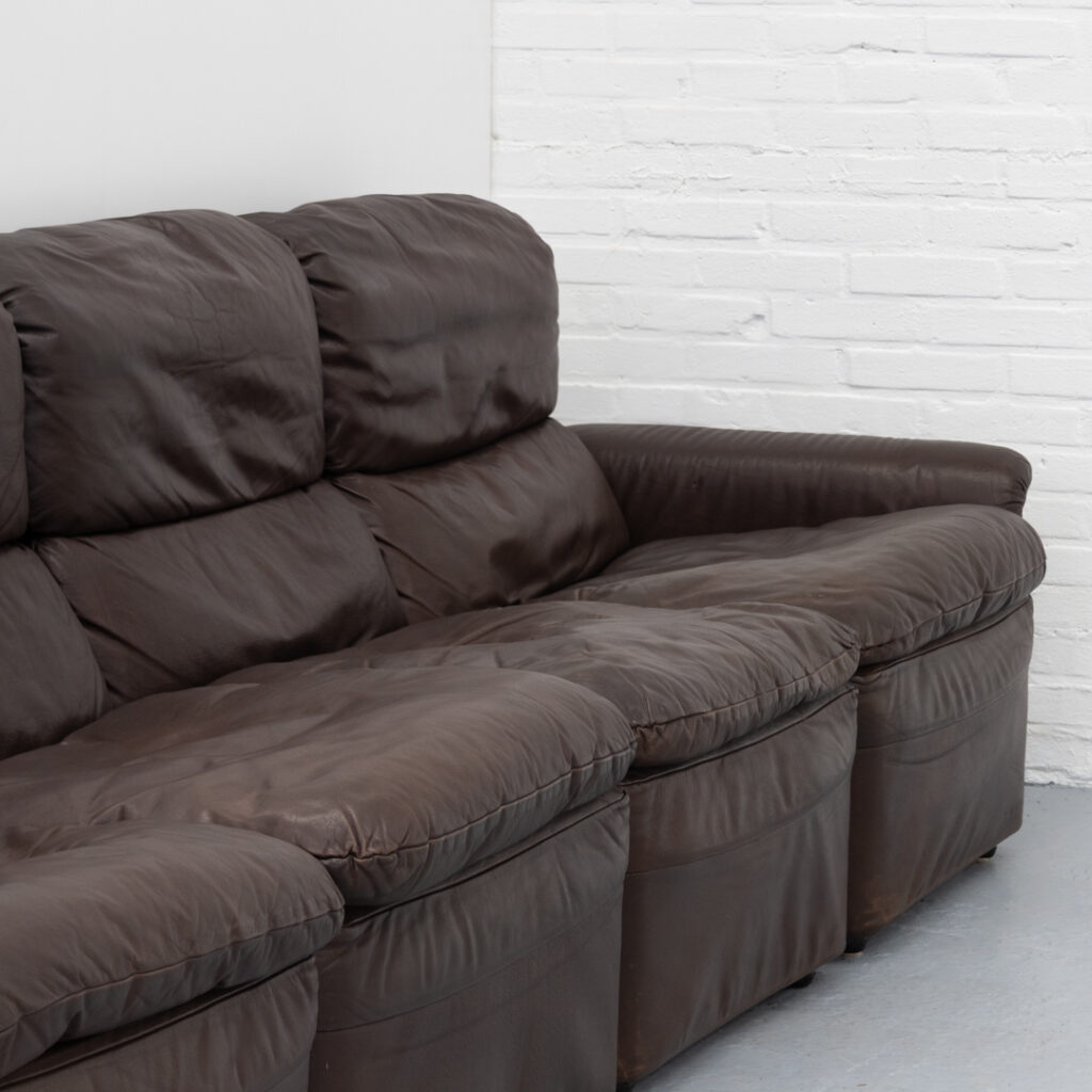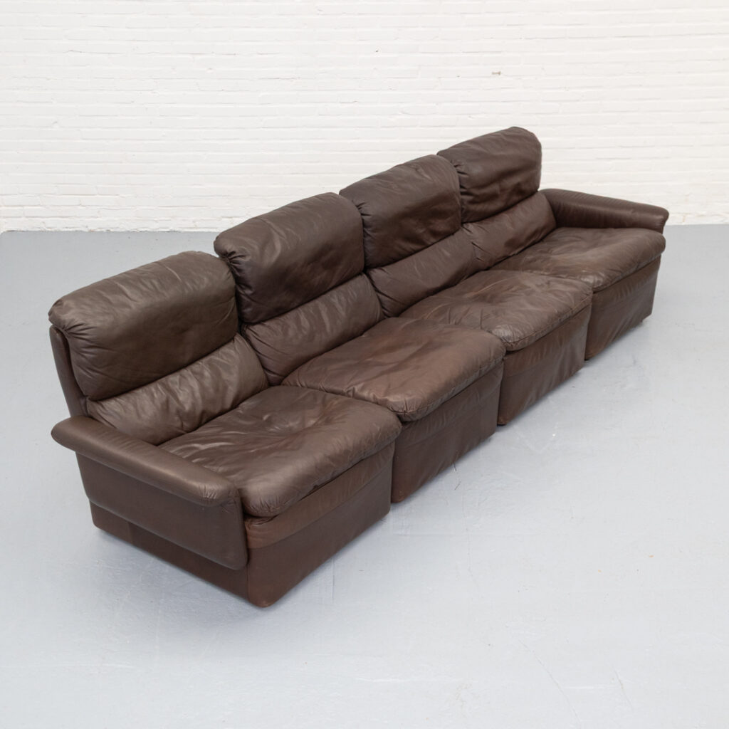1970s modular sofa of German origin, composed of four separate elements. Defined by its wide, low seating and generously cushioned form, giving it a relaxed, lounge-like presence. Upholstered in dark brown leather with a beautiful natural patina that reflects age and use, enhancing its character.