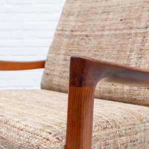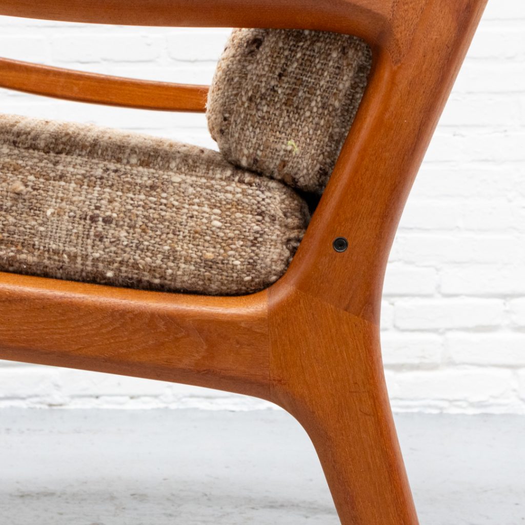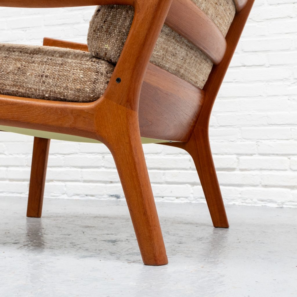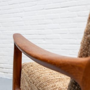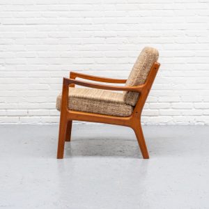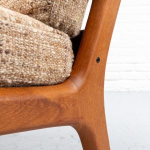 Comfortable Danish armchair, designed by Ole Wanscher for Cado in the 1950s/60s. The solid teak frame is elegantly crafted and in good condition, with a characterful patina appropriate to its age. The chair is upholstered in the original beige wool fabric and offers a pleasant seating experience. In good vintage condition, with light signs of wear consistent with age and use.