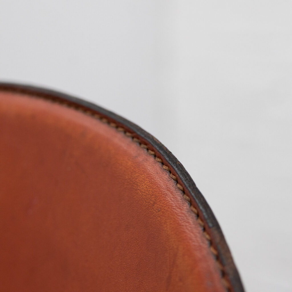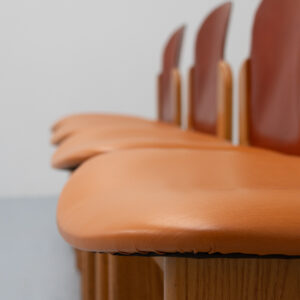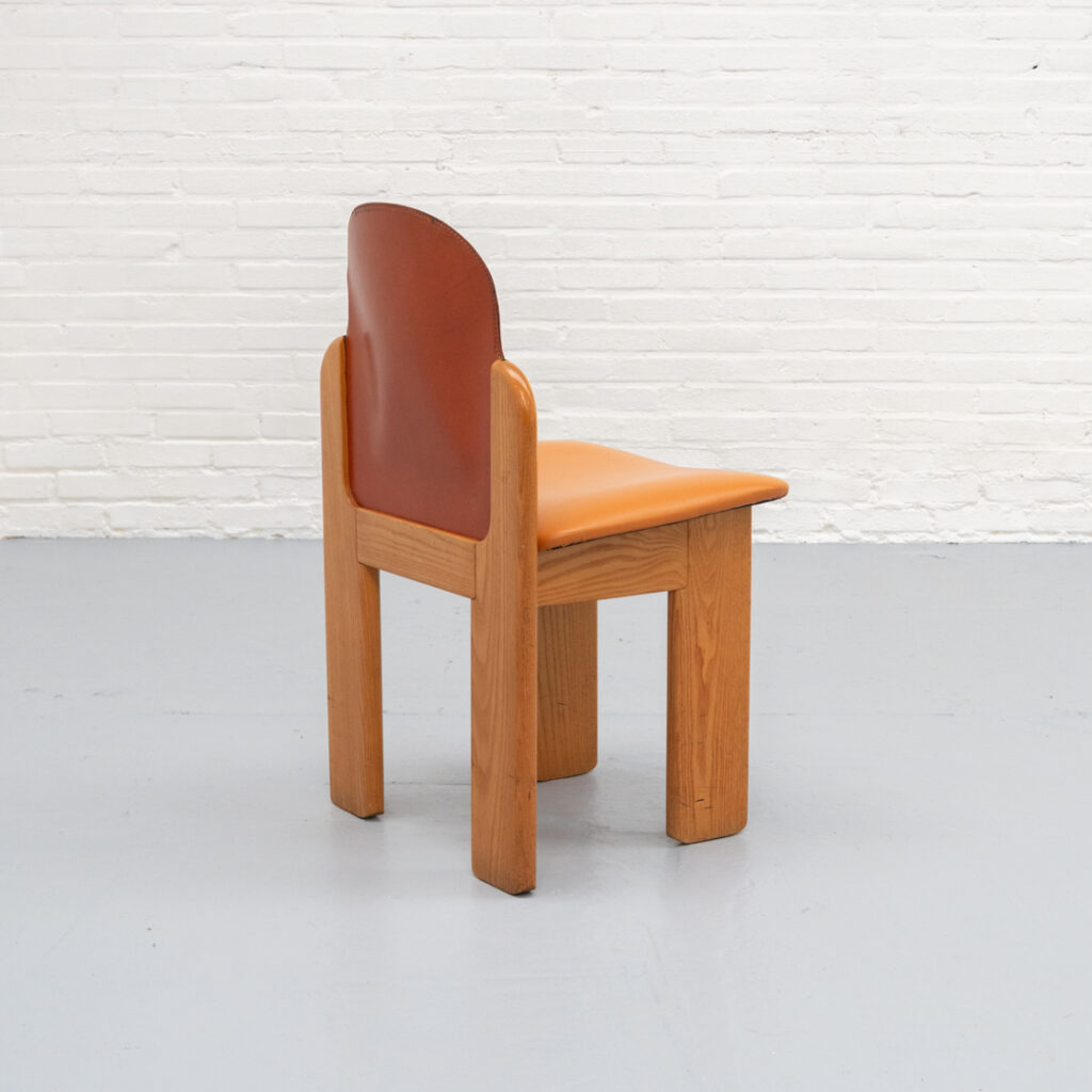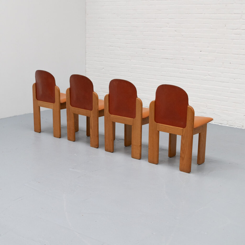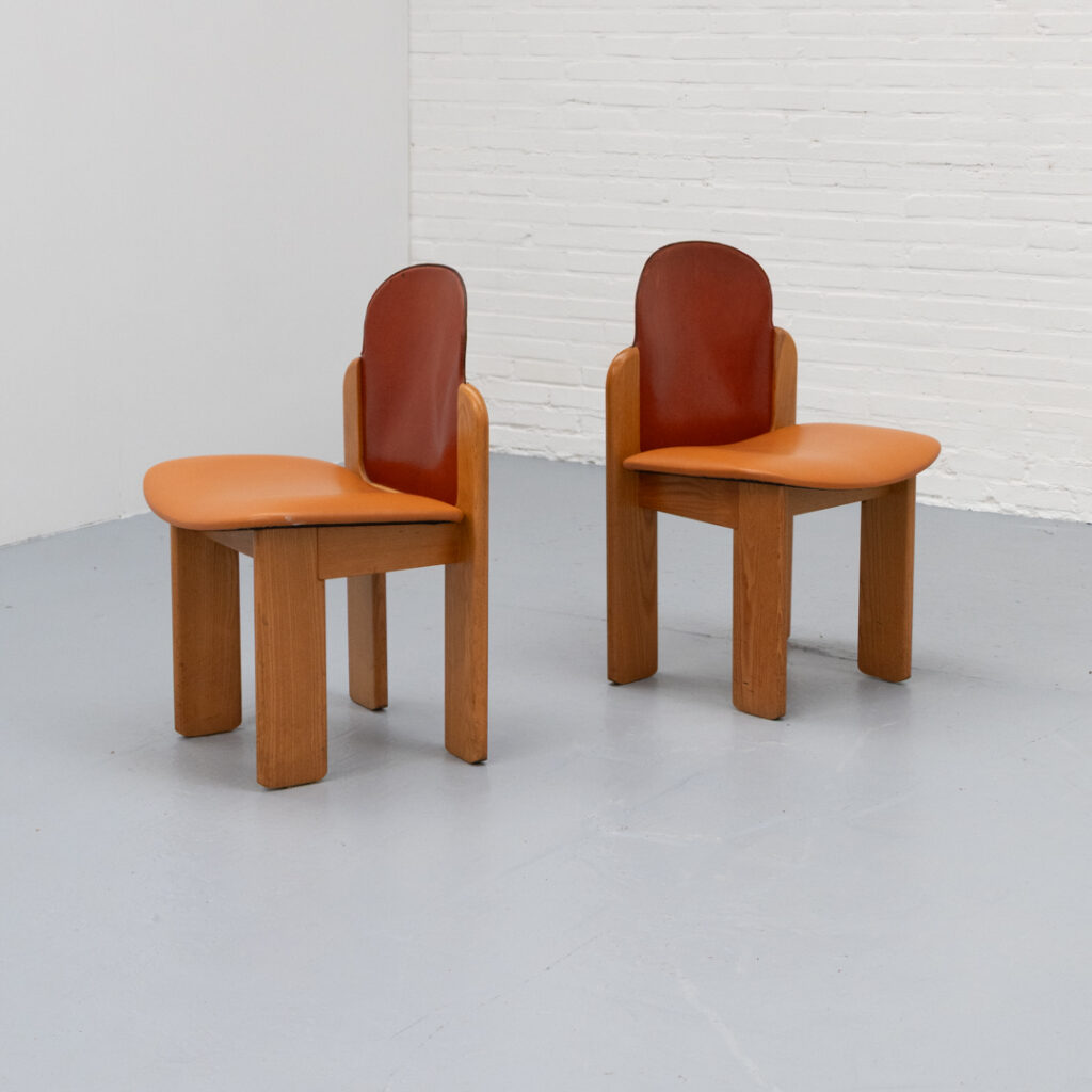 Set of four dining chairs, model ‘330’, designed by Silvio Coppola for Fratelli Montina, Italy, 1970s. A rare and beautiful dining set with organic shapes, crafted in ash wood and leather in rich, contrasting tones. The chairs have a natural and composed appearance, featuring smooth flowing lines, slightly overhanging edges, and a solid base. The combination of wood and leather gives them an elegant handcrafted character. A true collector’s find, as these are becoming increasingly hard to come by. In good vintage condition with a lovely patina and light signs of use consistent with age.