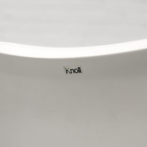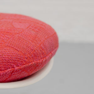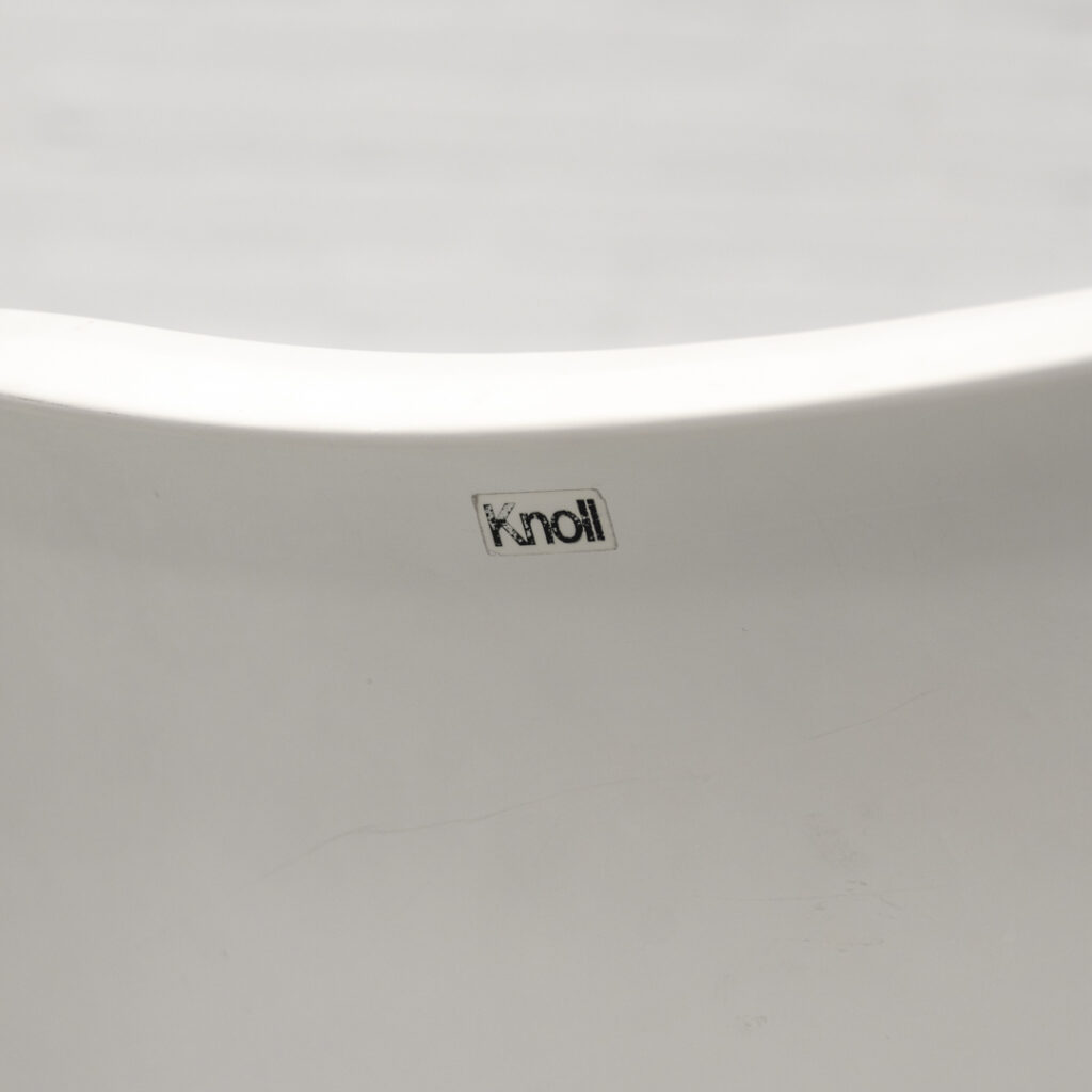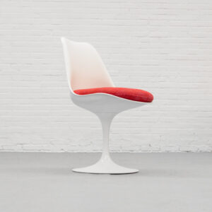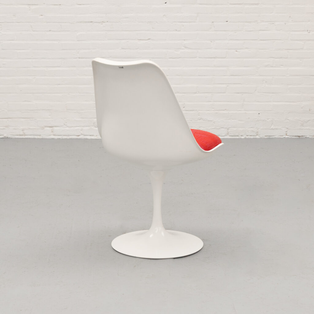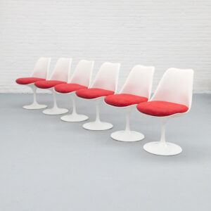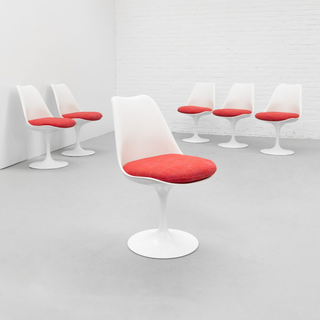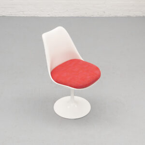 A refined and timeless design featuring a molded fiberglass shell that flows seamlessly into the characteristic tulip base in coated aluminum. The fluid, organic form contrasts subtly with the clean base, resulting in a calm and well-balanced presence. Each chair retains its original seat cushion in a warm red tone, finished in a finely woven geometric fabric. The subtle texture and tonal variation add depth and visual richness. Non-swivel version (model 160/161), all chairs are marked by Knoll. The early production date combined with the original upholstery enhances the authenticity of the set. In very good original vintage condition, with light signs of use consistent with age.